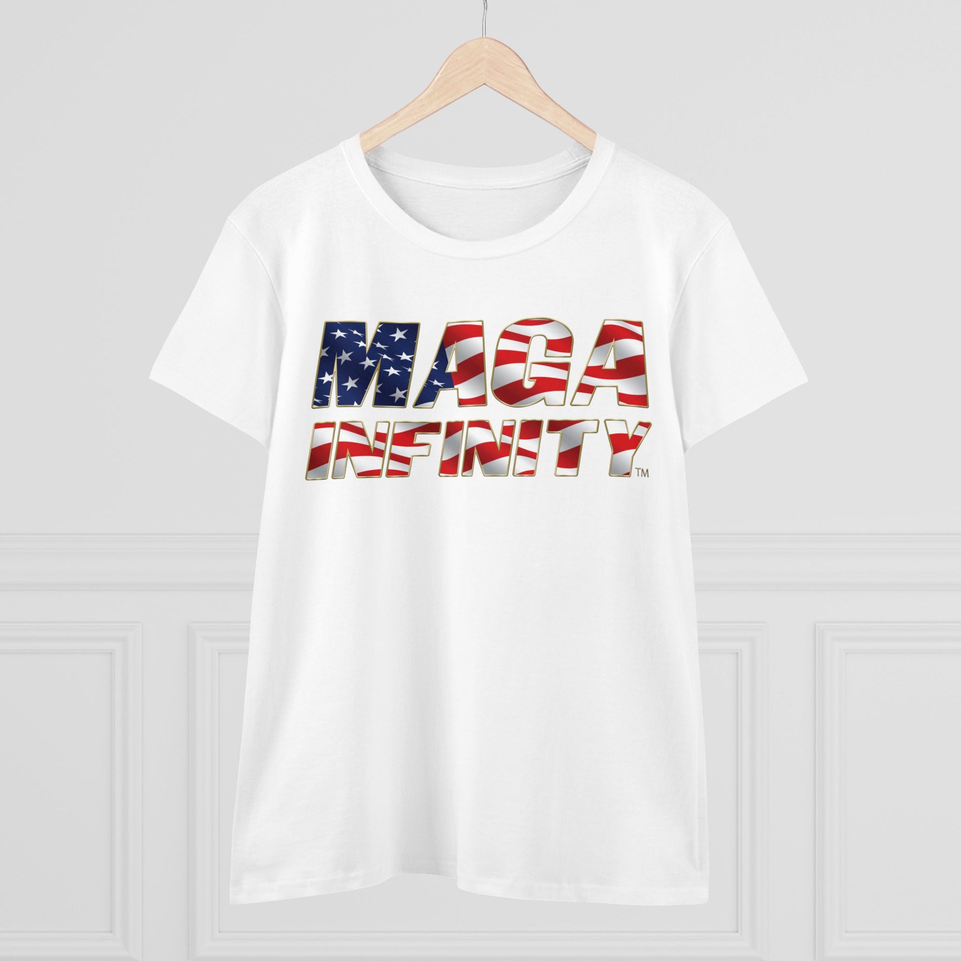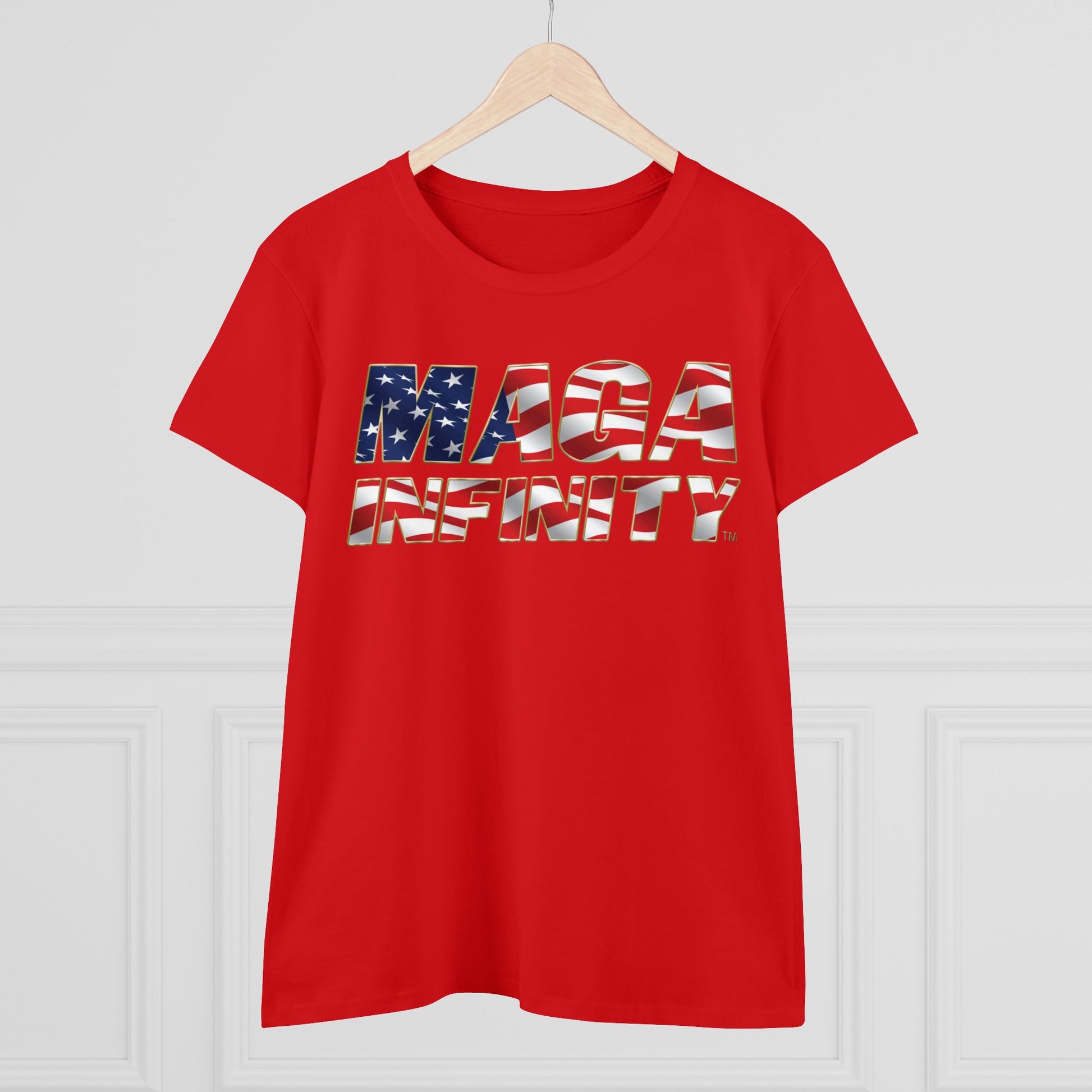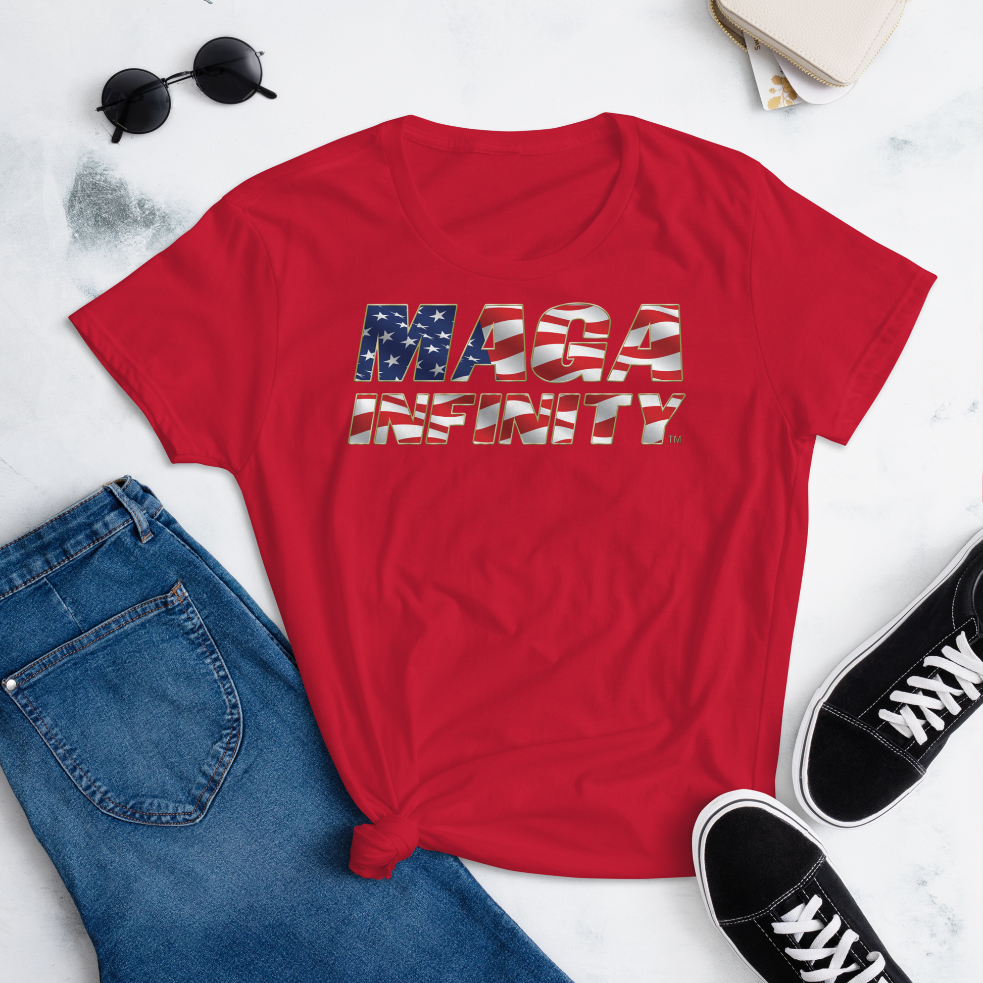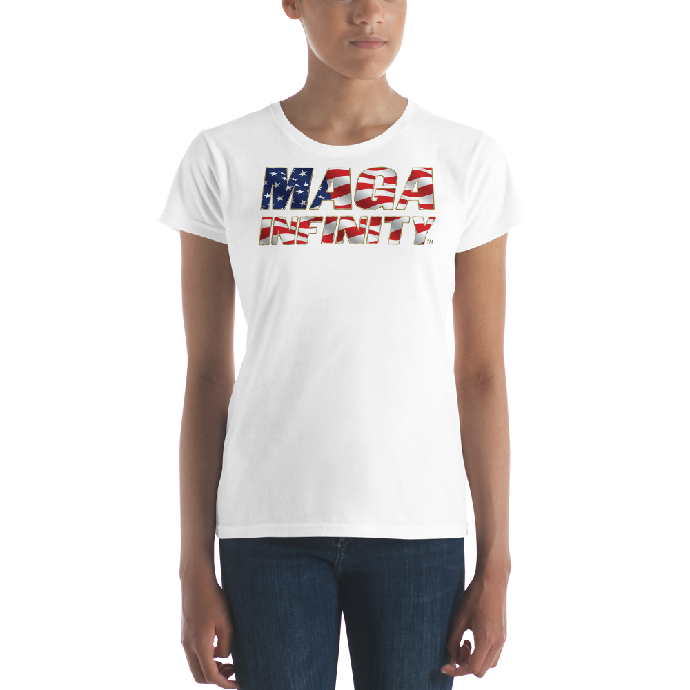 Proclaim your patriotism and faith with our premium two-sided, MAGA Infinity American Flag Logo women's T-Shirt, 100% made in the USA!