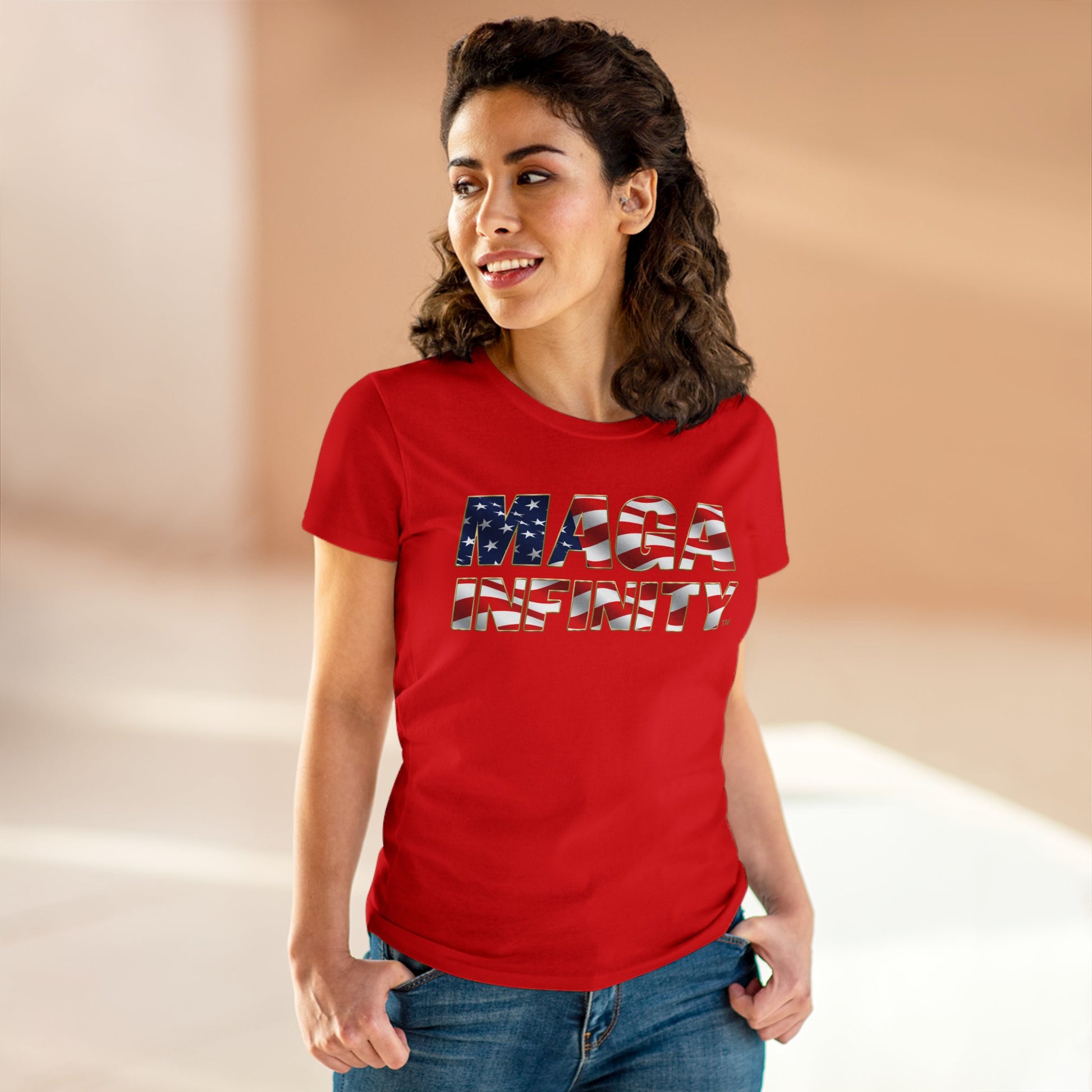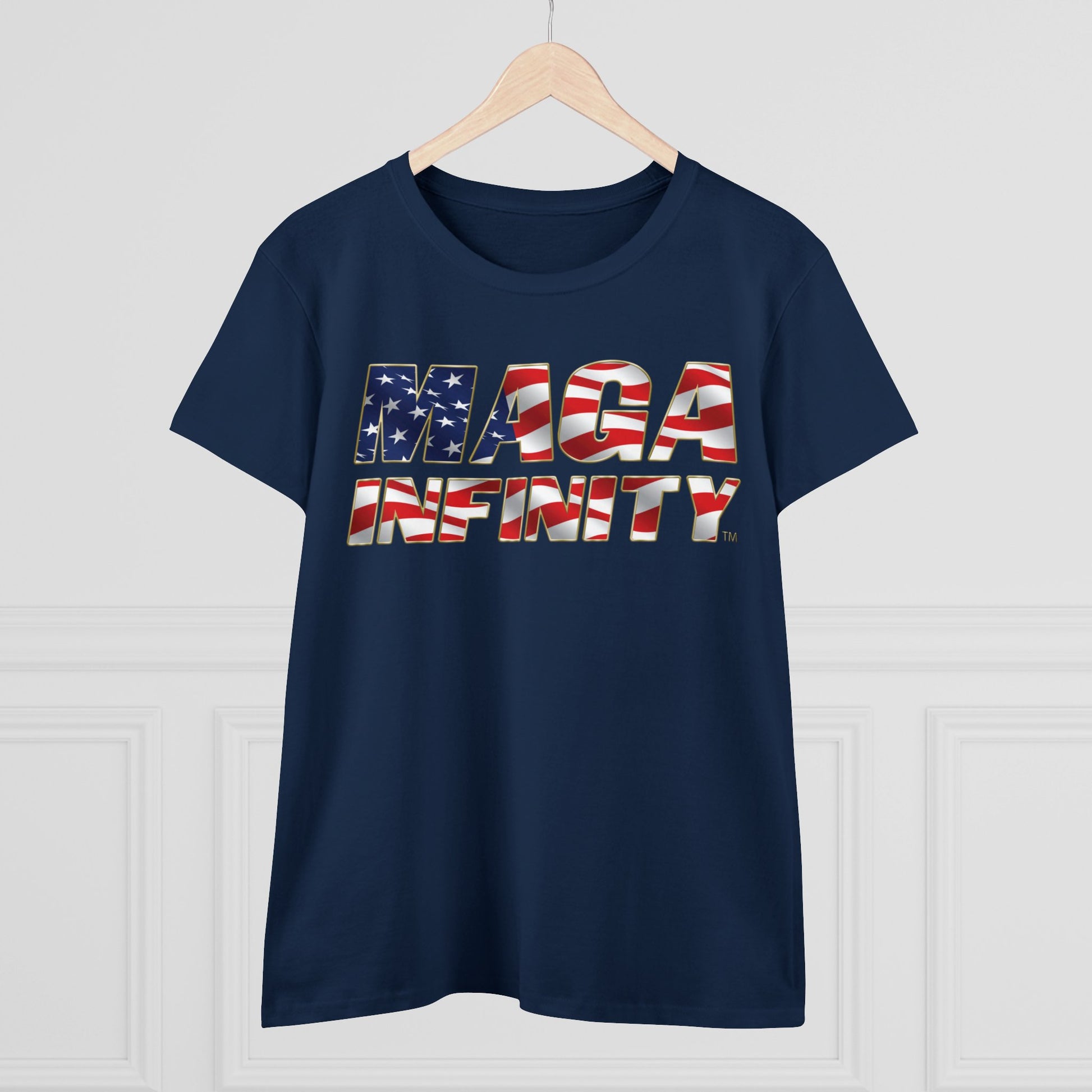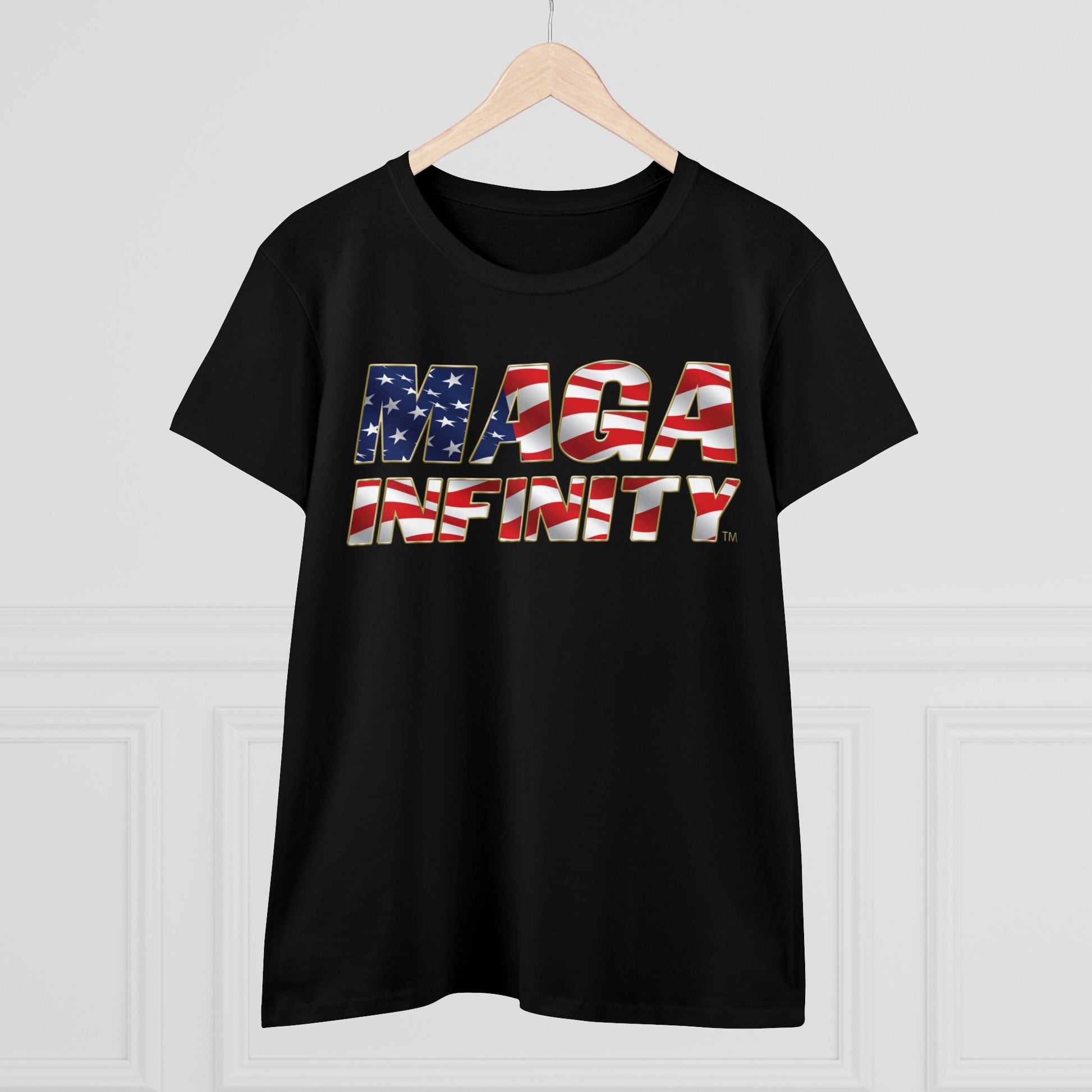 Proclaim your patriotism and faith with our premium two-sided, MAGA Infinity American Flag Logo women's T-Shirt, 100% made in the USA!