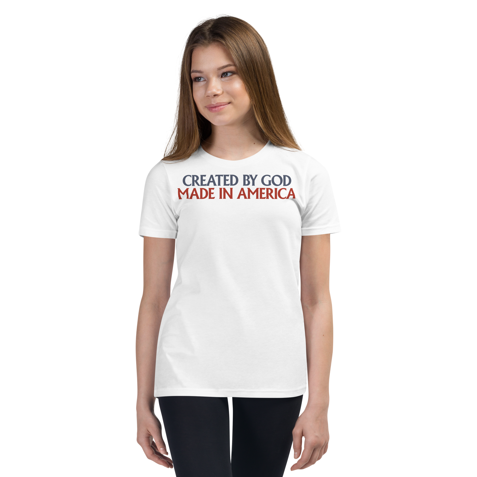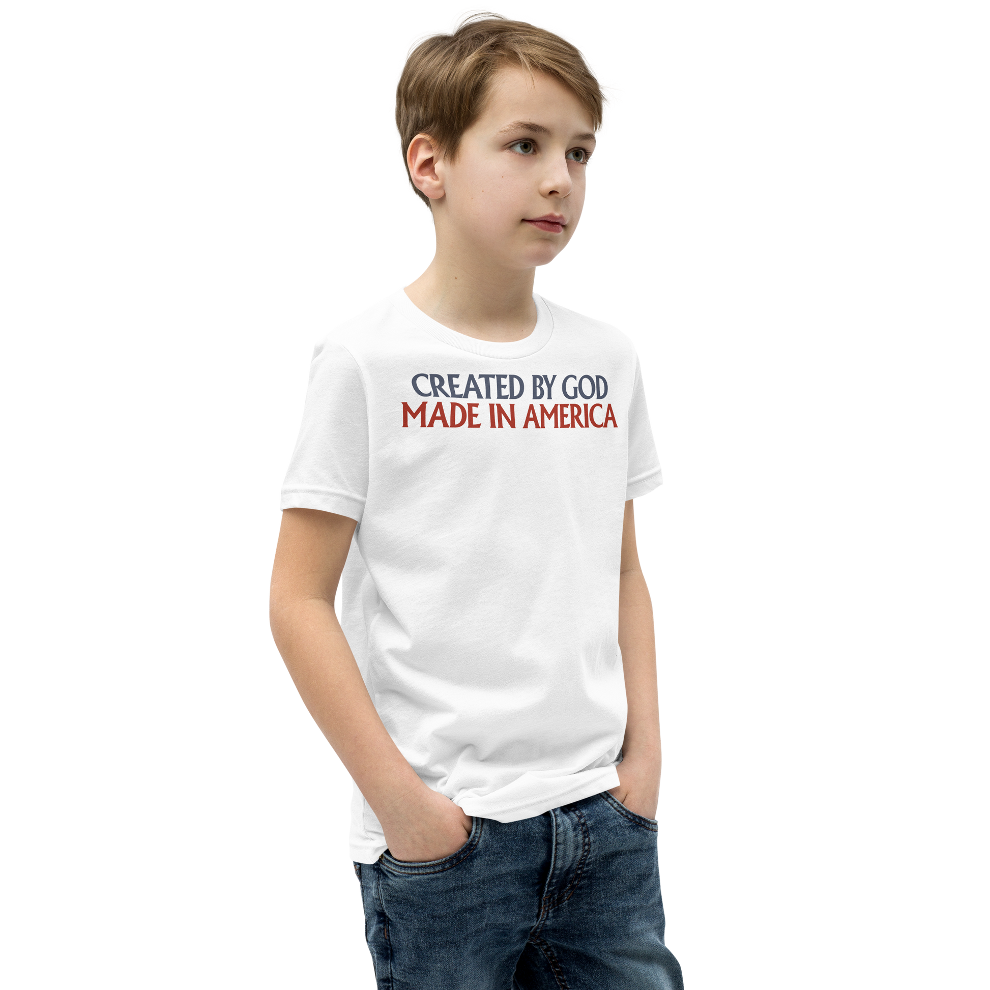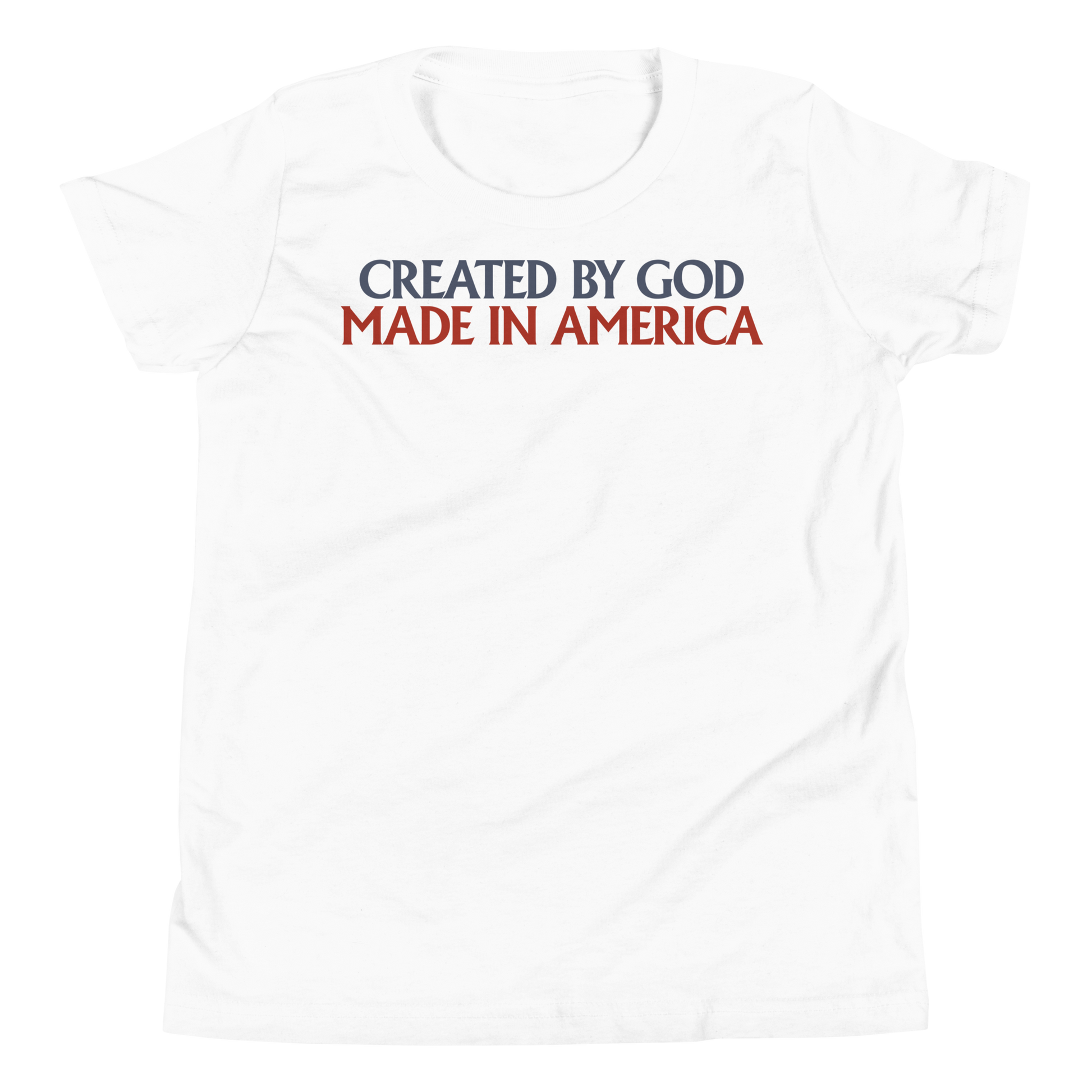 Inspire your child's love of God and Country with our Created By God, Made In America Patriotic Christian Kid's T-Shirt!