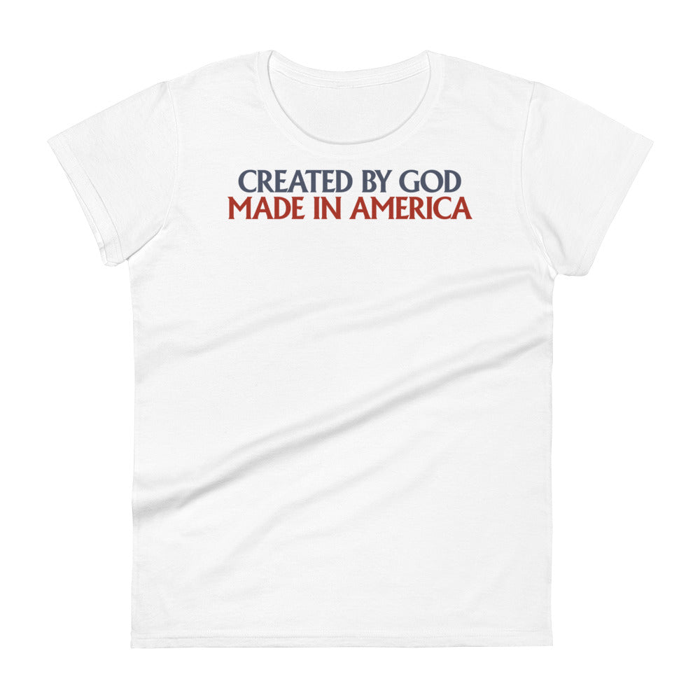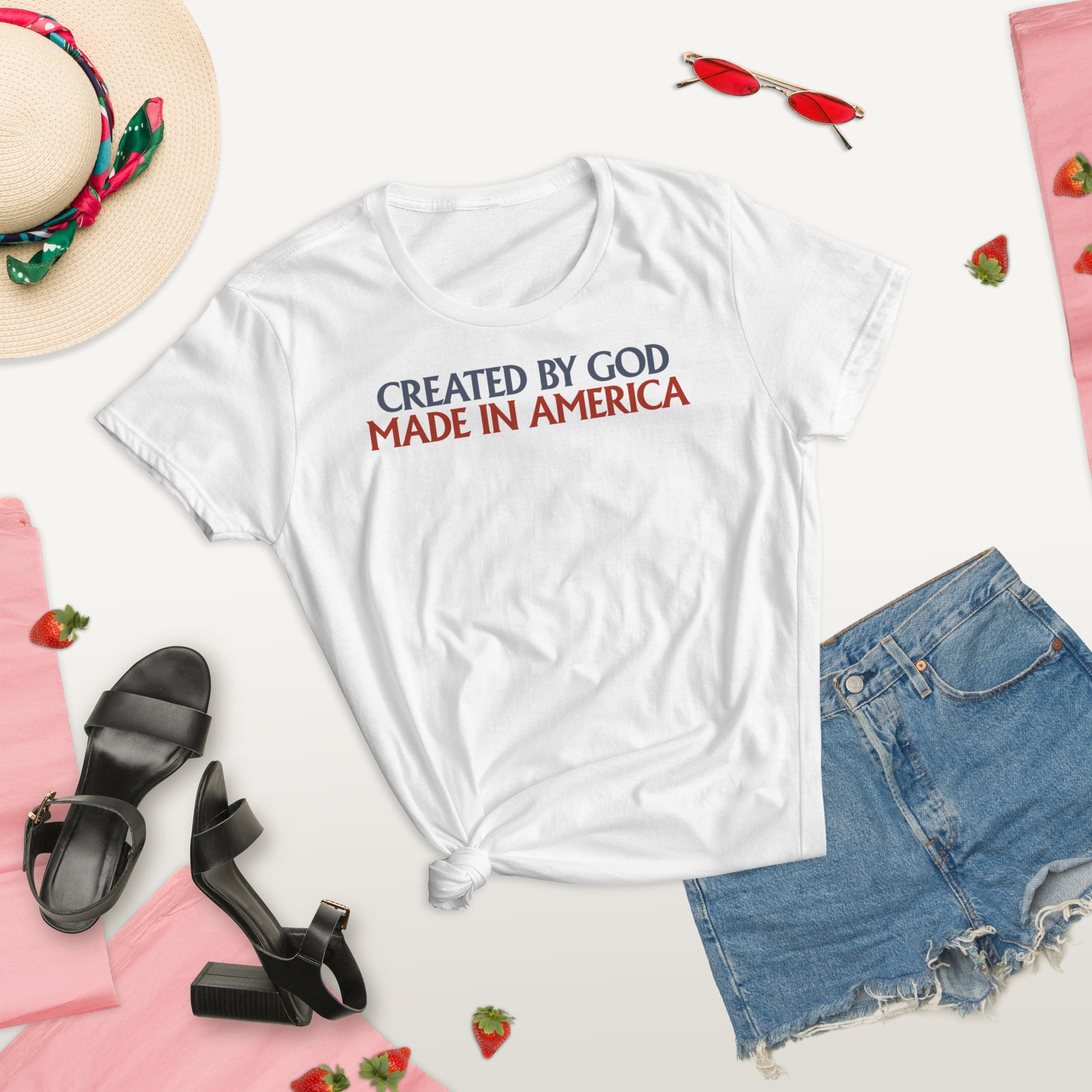 Celebrate your Faith and Patriotism with our Created By God, Made In America Women's T-Shirt!