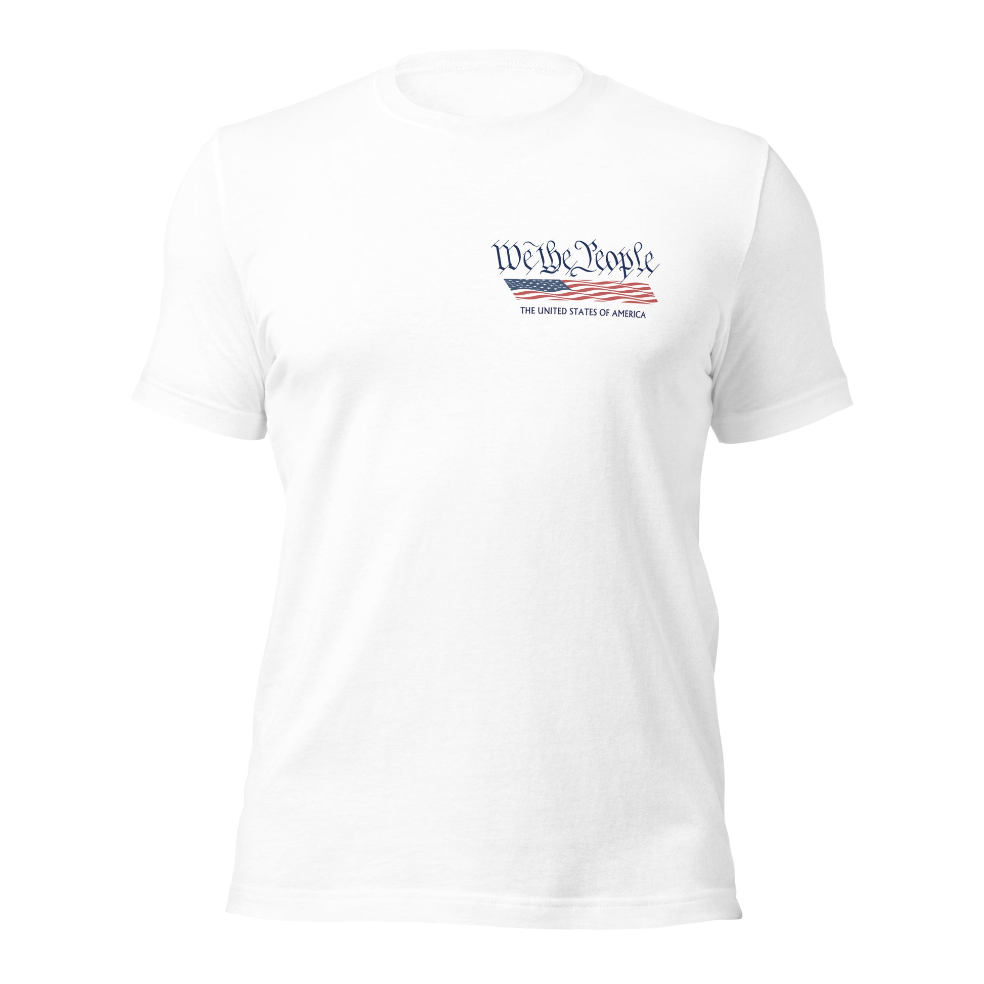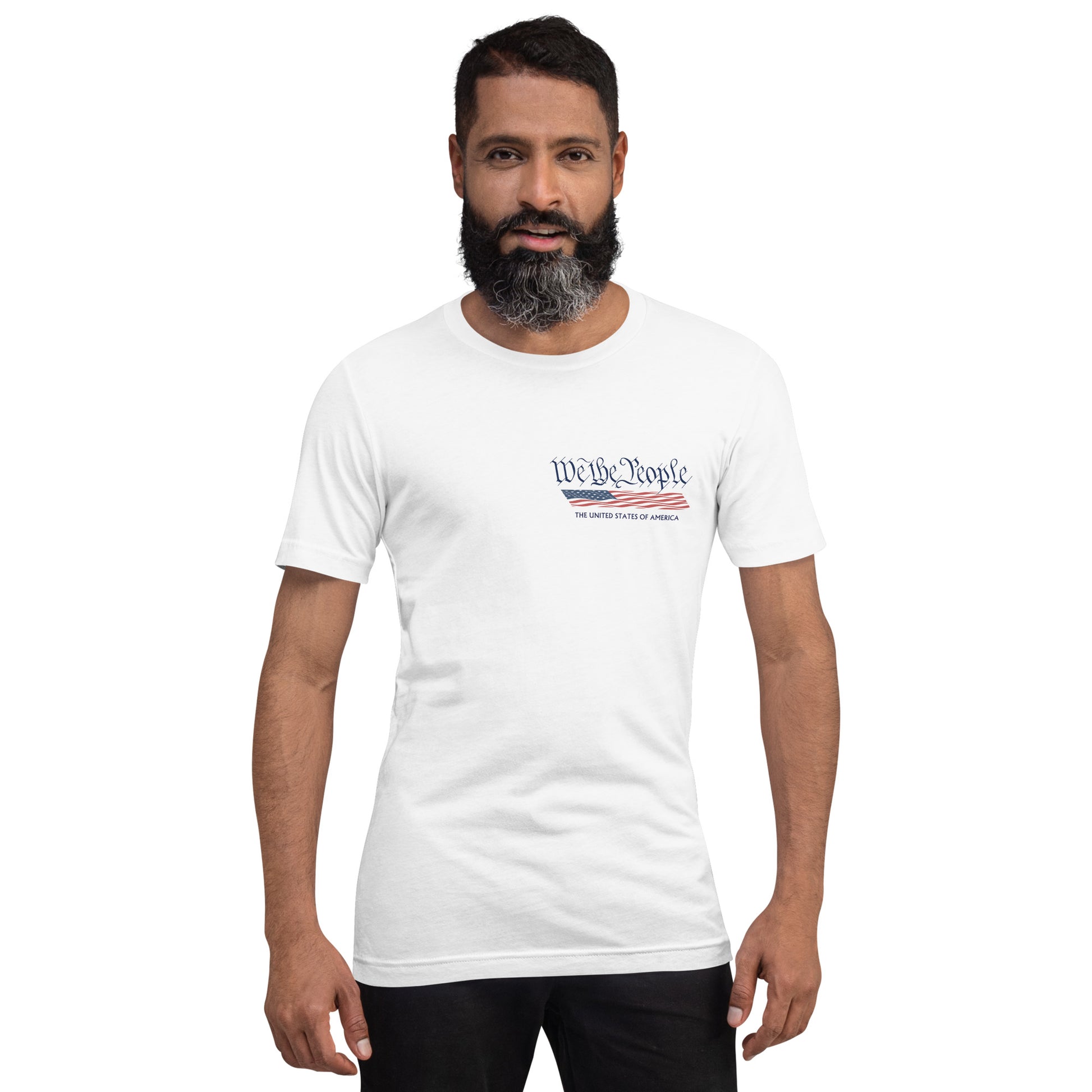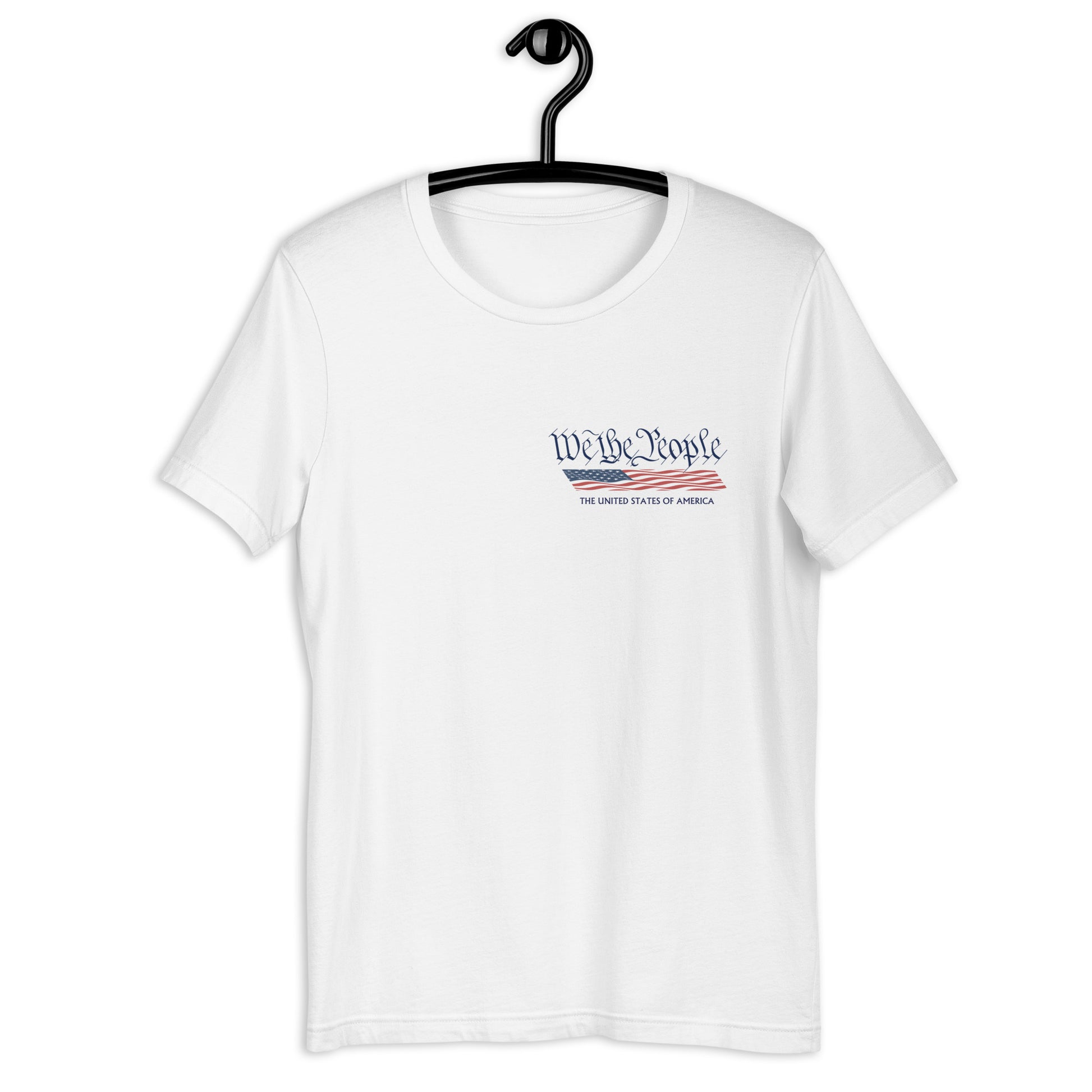 On the front of this two-sided tee is a graphic of the American flag and the words, "We The People - The United States Of America."