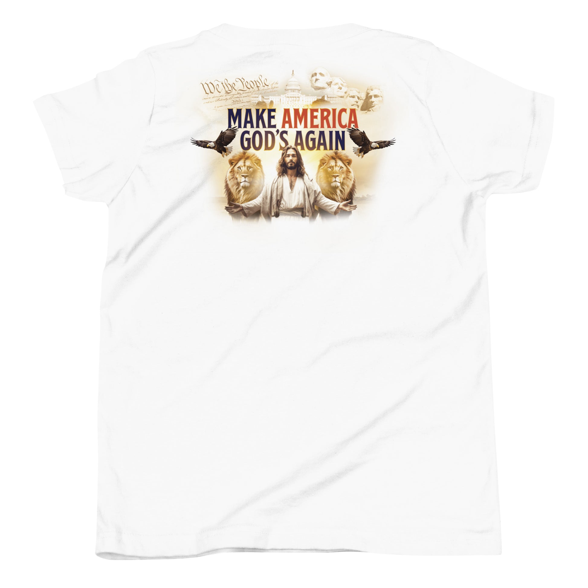 On the back is a picture of Jesus in front of symbols of American freedom, and flanked by two lions. Above him it reads, "Make America God's Again."