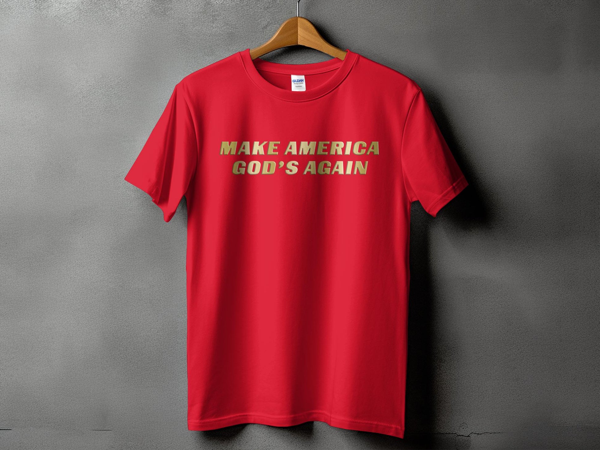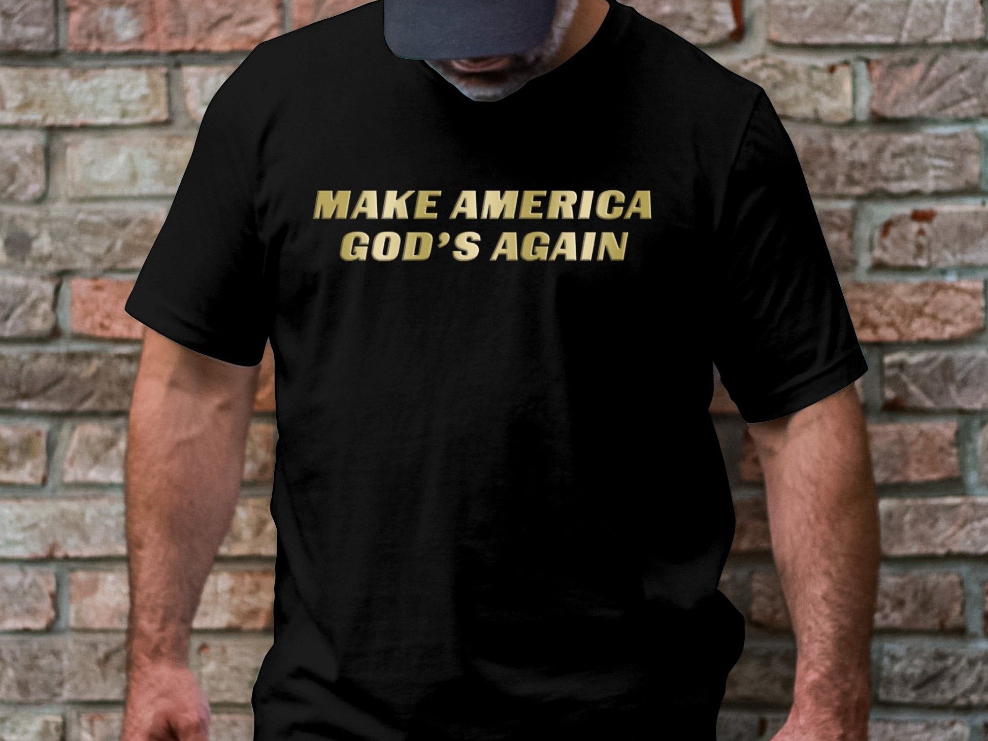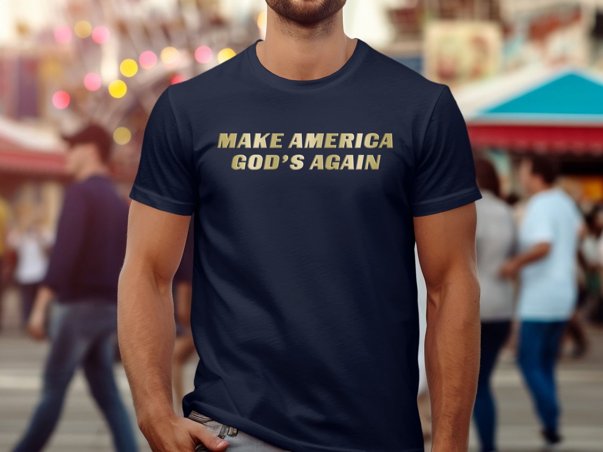 Proudly declare your faith and love of country with our premium Make America God's Again Men's T-Shirt, with gold lettering.