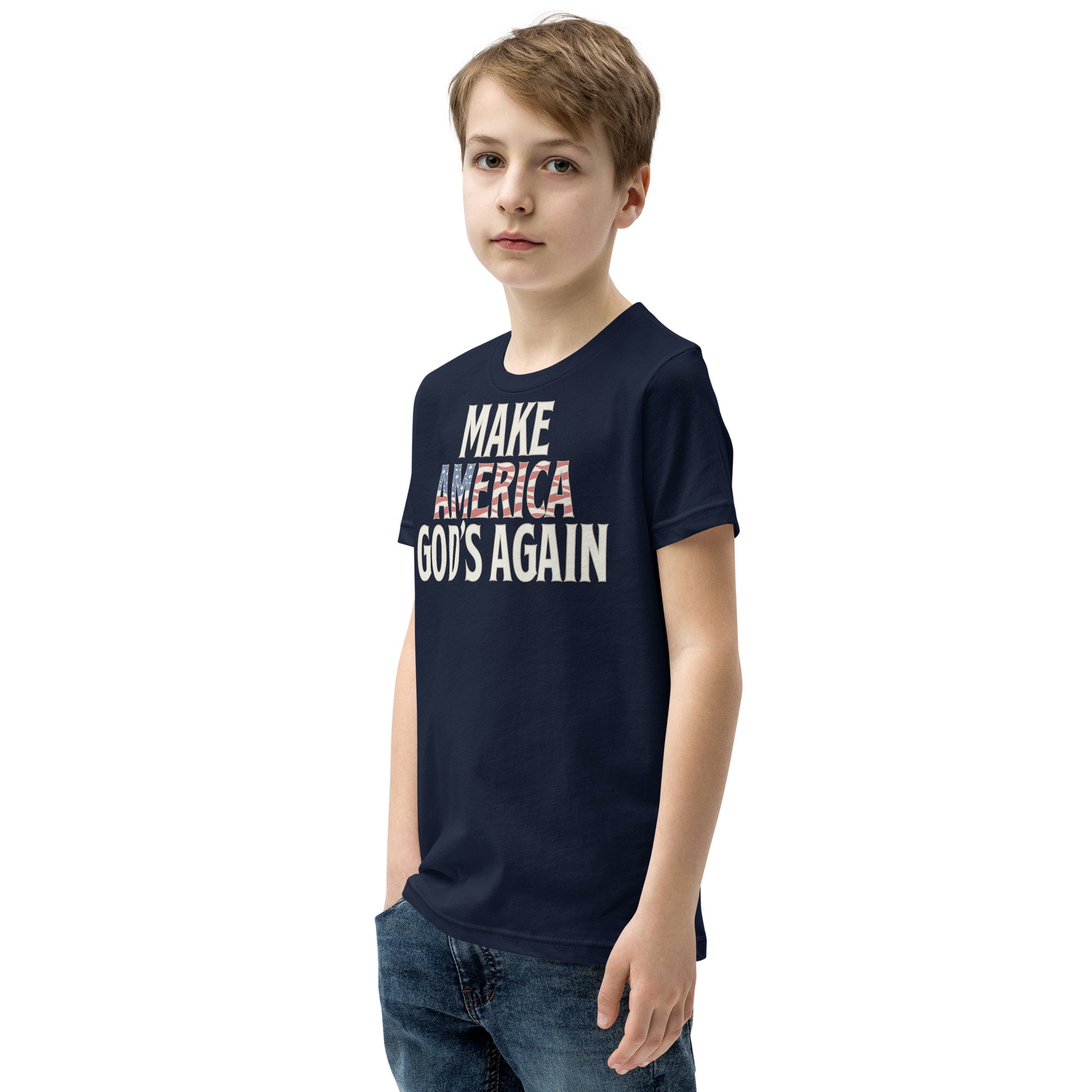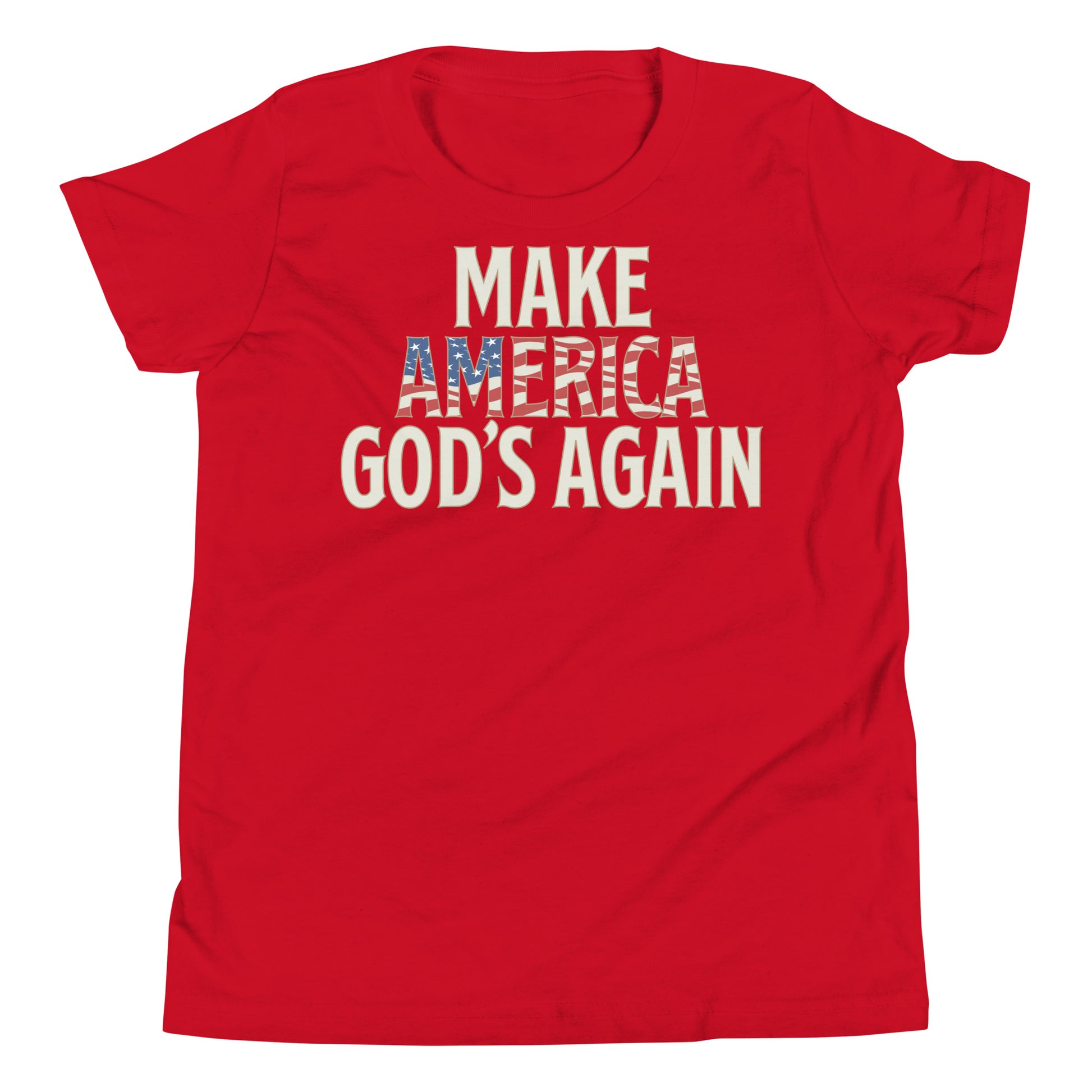 Help your child's patriotism shine with our Make America God's Again Patriotic Kids' T-Shirt.