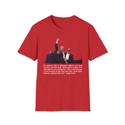 On the front of the teeshirt is the now iconic picture of President Trump with his fist definately raised shortly after an attempt on his life. Below that are the words of Isaiah 54:17: