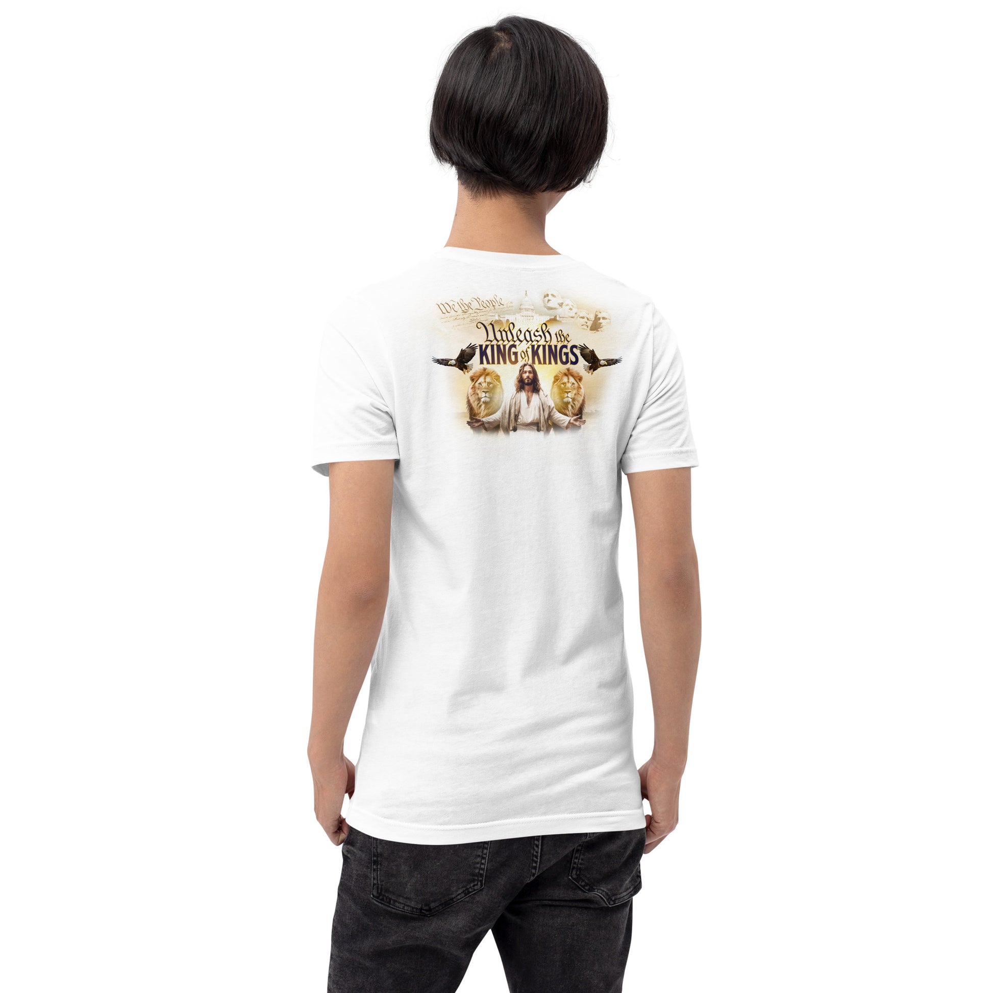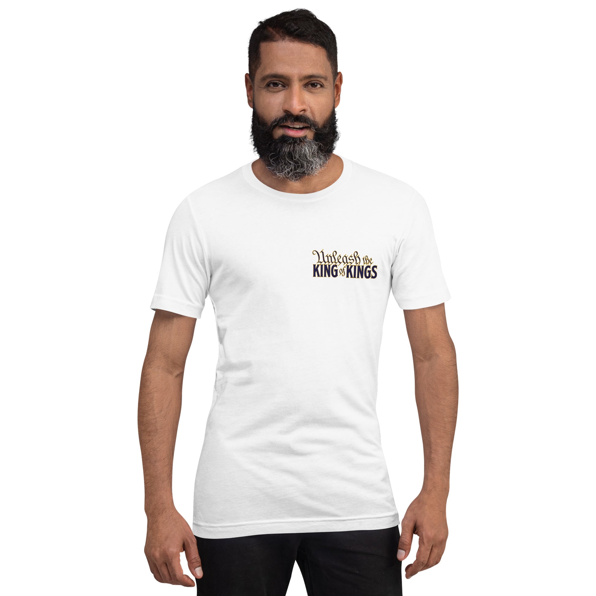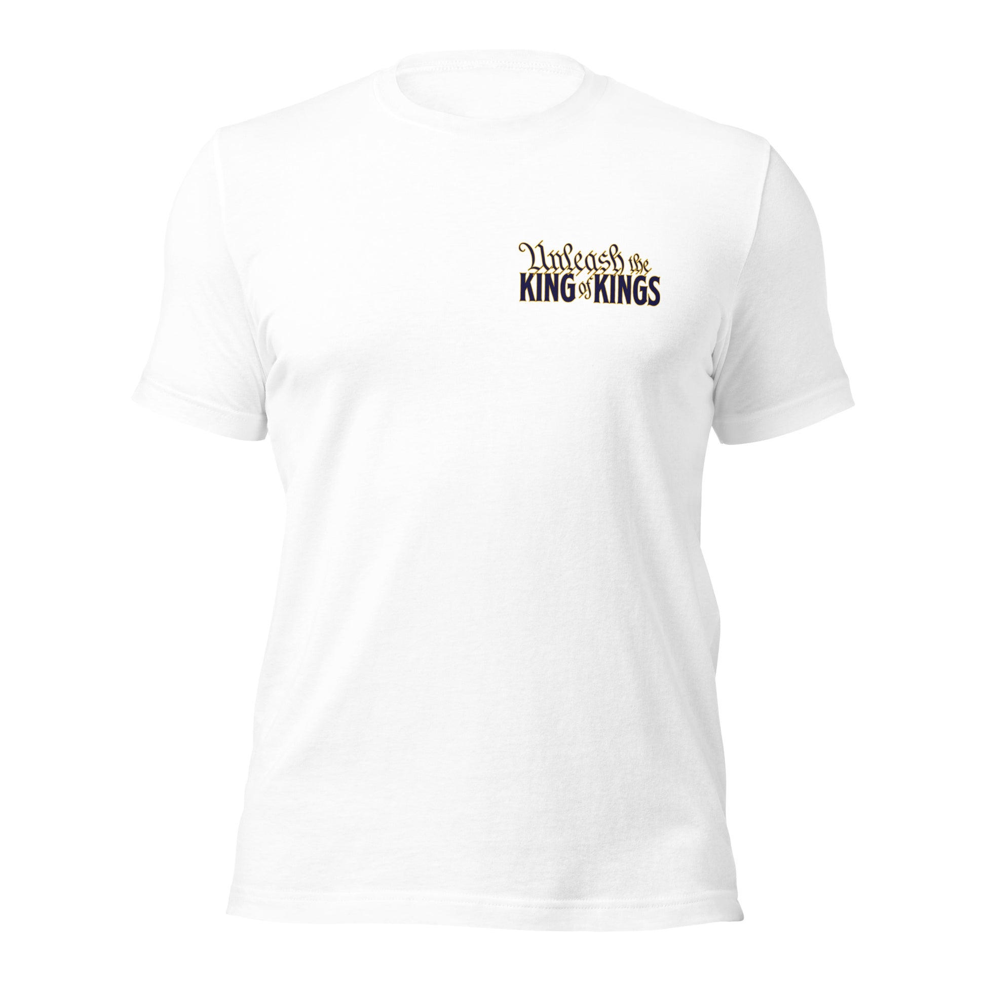 On the front of this two-sided tee it says, "Unleash The King Of Kings."